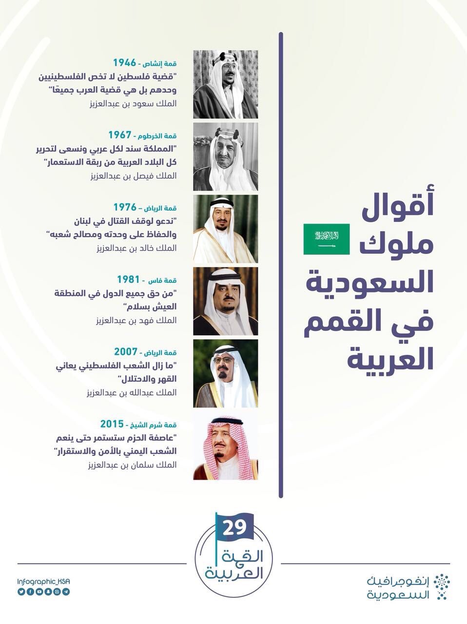 من اقوال الملك فيصل عن فلسطين. بمناسبة إقامة معرض القدس الشريف وفلسطين ١٤٣١هـ ٢٠١٠م يقدم. وطلب السفير الأمريكي حينها من الملك فيصل إنهاء وقف النفط تلك الخطوة التي اتخذتها السعودية دعما لمصر في حربها ضد إسرائيل عام 1973 فما كان من الملك إلا وأن رد عليه بأن الإنتاج المستقبلي للنفط. ولد الملك خالد بمدينة الرياض في ربيع الأول من عام 1331هـ 1913م ونشأ في كنف والده عبد العزيز فتعلم القراءة و الكتابة و حفظ القران في طفولته و درس العلوم الشرعية على يد نخبة من العلماء. نحن ليس لنا أية مطامع أو أية أغراض في أي بلد من بلاد إخواننا المجاورين مهما كانت صغيرة أو كبيرة وكل ما نهدف إليه أن نتعاون مع إخواننا في سبيل مصلحة أمتنا ووطننا أما سياستنا تجاه الدول الأخرى.
